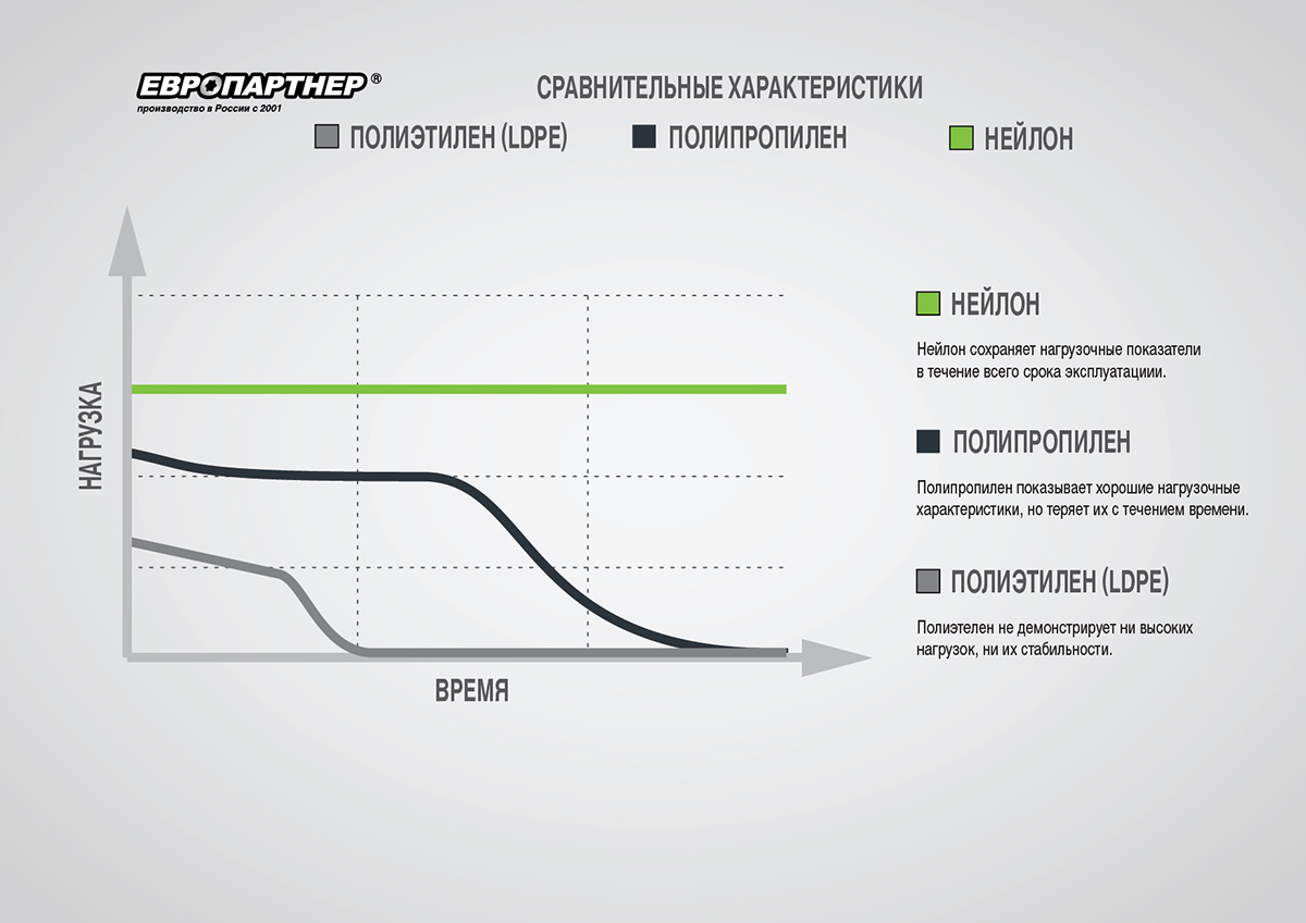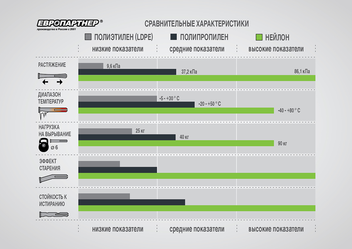 Полипропилен показывает средние нагрузочные характеристики, но теряет их с течением времени. Крепежные изделия из полипропилена используются для внутренних работ.