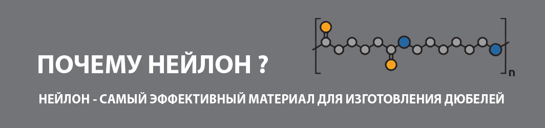 Безусадочный и не текучий материал, обладающий высокой стойкостью к старению, к воздействию тепла и химических веществ. Диапазон температур эксплуатации от -40 до +80ºС. Нейлоновые дюбели отличаются прочностью, износостойкостью и высокими нагрузочными характеристиками. Крепежные изделия из нейлона используются для наружных и внутренних работ.