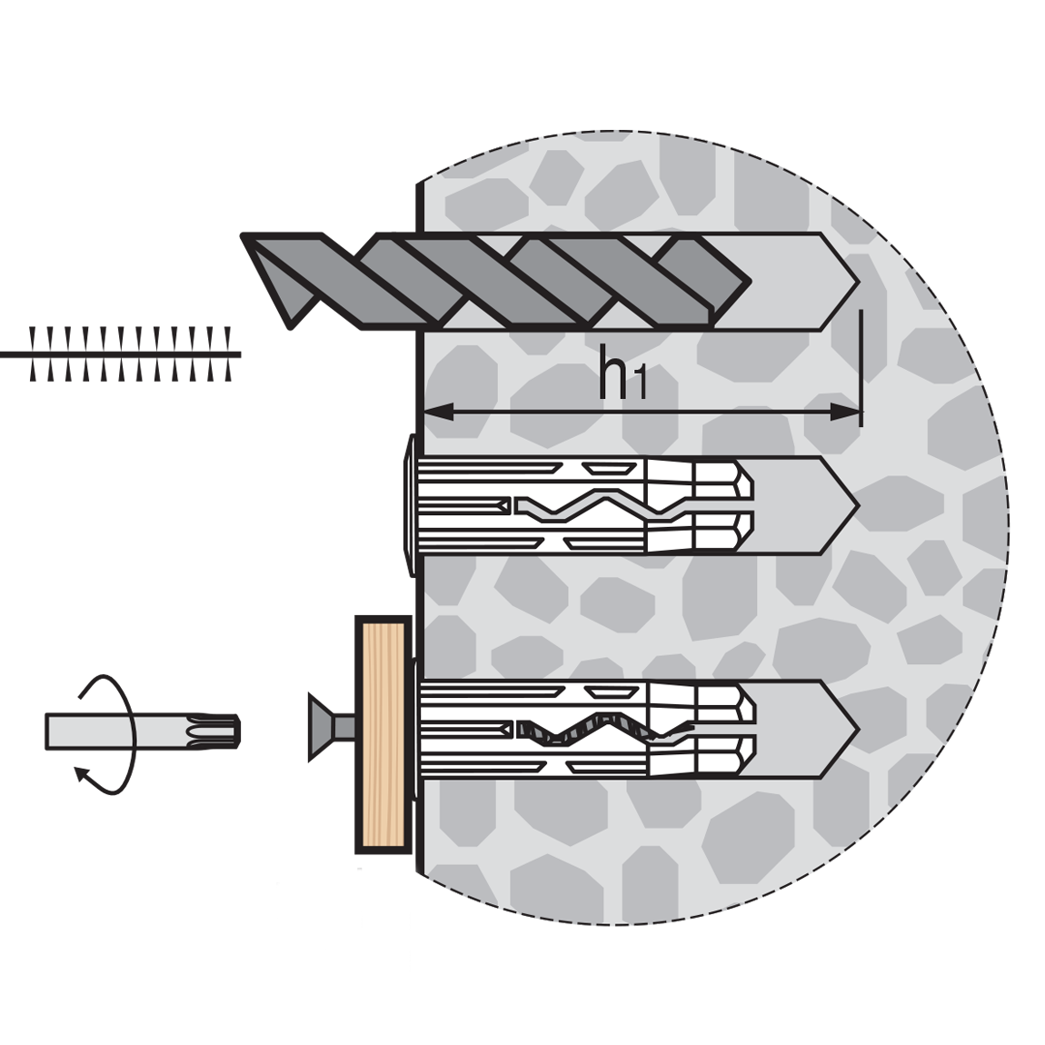 - Шестигранная форма предотвращает прокручивание дюбеля в отверстии в момент установки;