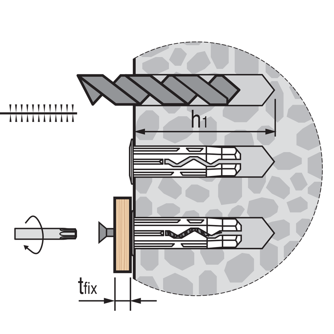 - Шестигранная форма предотвращает прокручивание дюбеля в отверстии в момент установки;