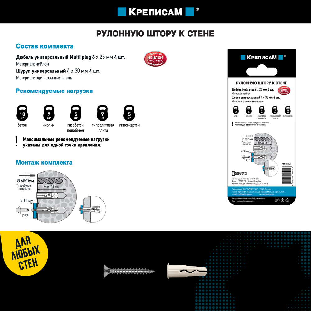 материале основания. Материал дюбеля - нейлон гарантирует долгий срок службы