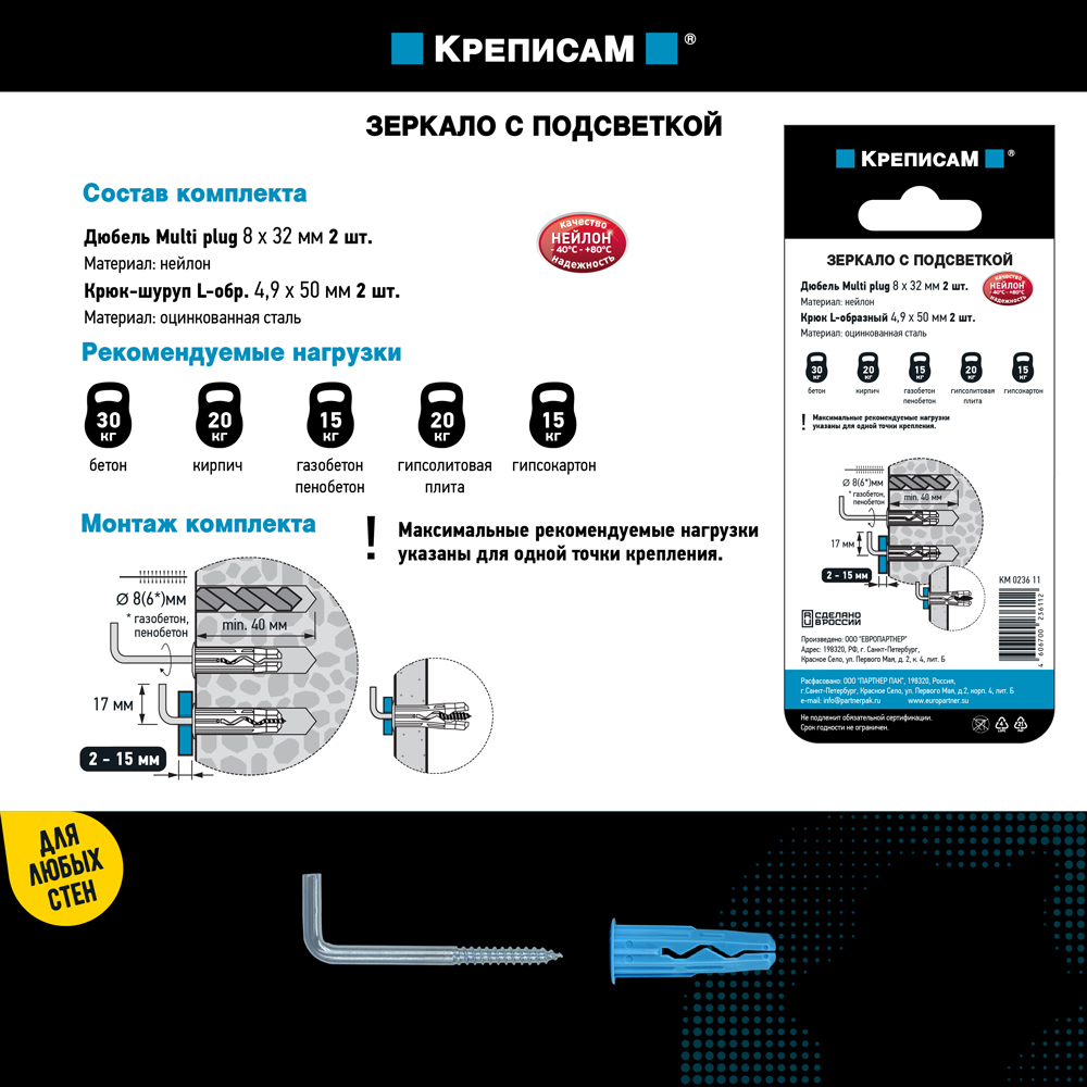 Благодаря комплектному универсальному дюбелю MULTI - применяется в любом