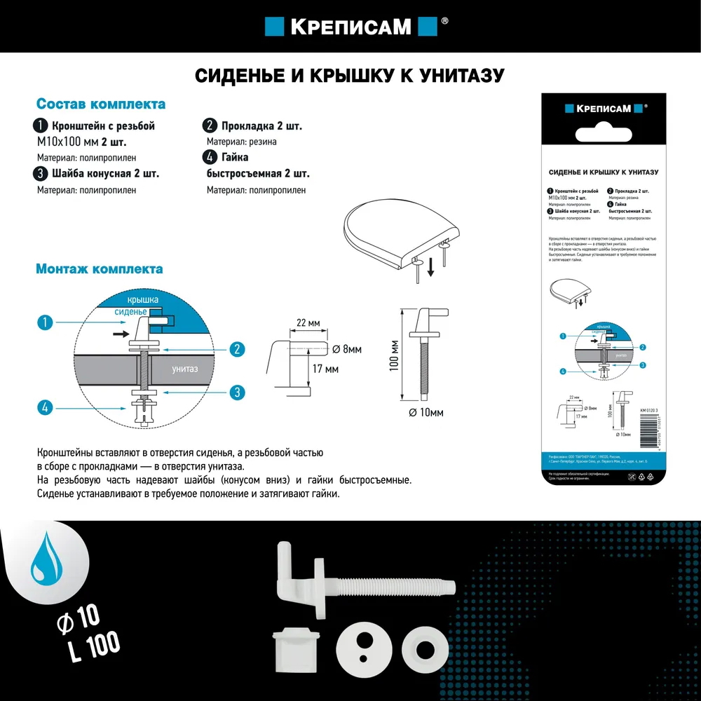 Кронштейн с резьбой 10х100 2шт; Прокладка 2шт; Шайба конусная 2шт; Гайка быстросьемная 2шт