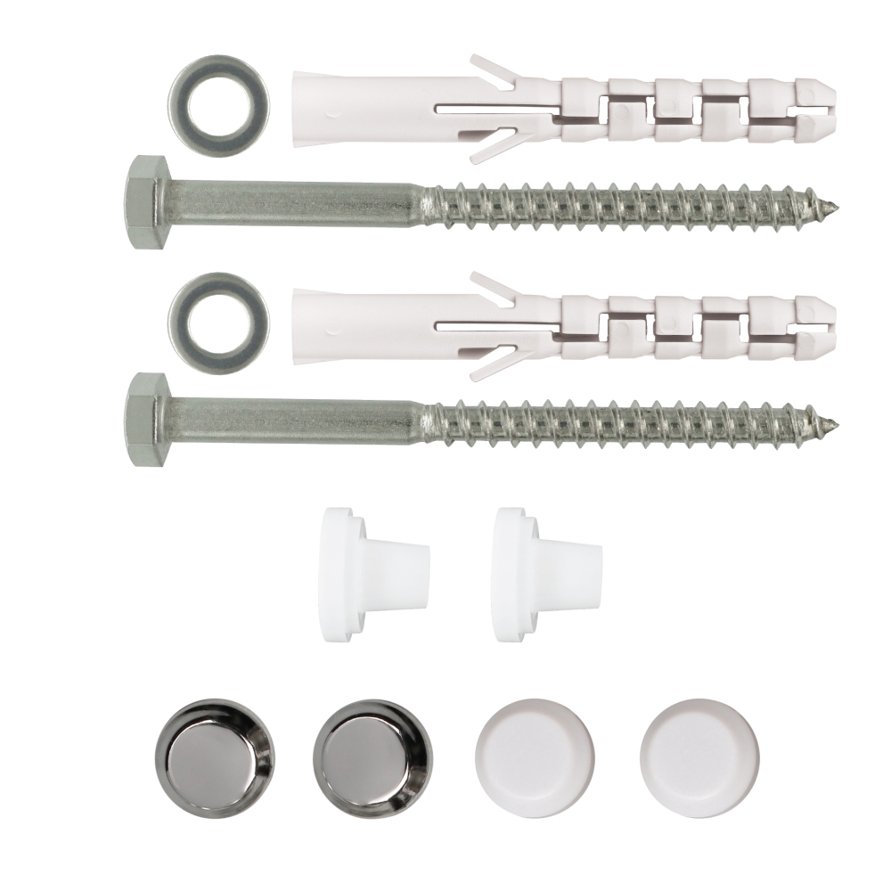 Дюбель распорный нейлоновый PNDL 8х65мм 2шт; Шуруп DIN571 сантехнический нержавеющий А2 6х80мм 2шт; Шайба DIN125 нержавеющая А2 М6 2шт; Втулка пластиковая 2шт; Колпачки декоративные на выбор: хром 2шт/белые 2шт