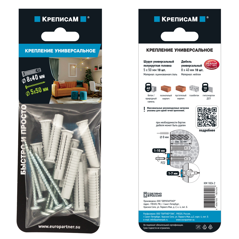 Дюбель универсальный нейлоновый PDUN 8х40мм 10шт; шуруп универс. 5,0х50мм полукругл. гол. 10шт.