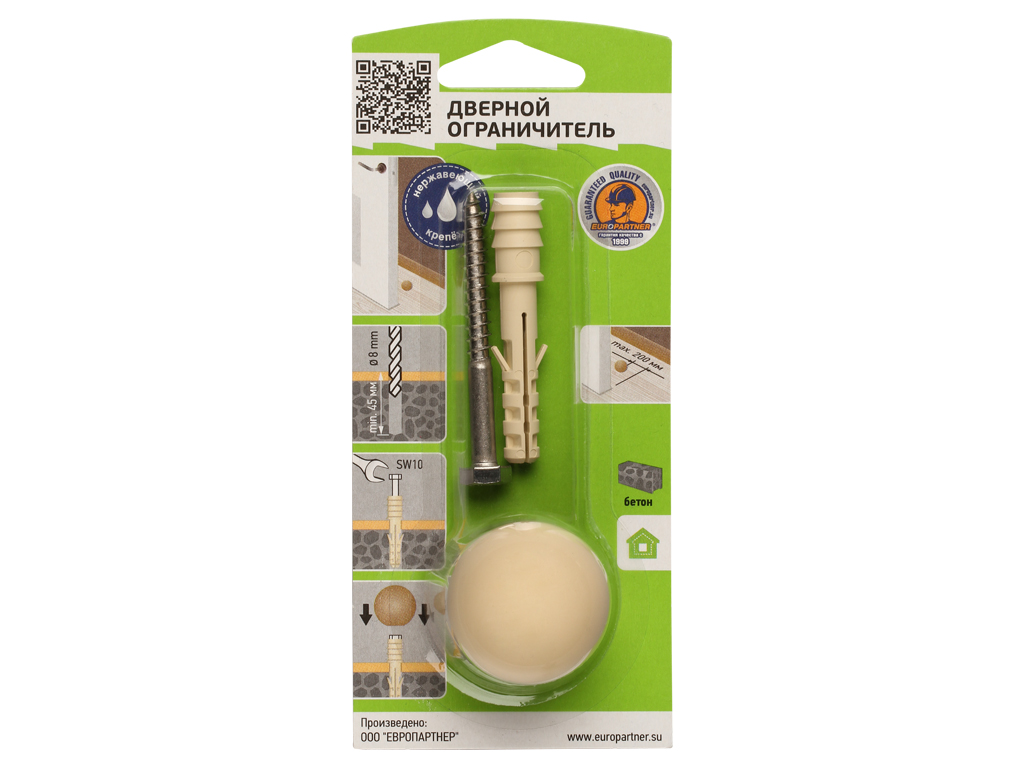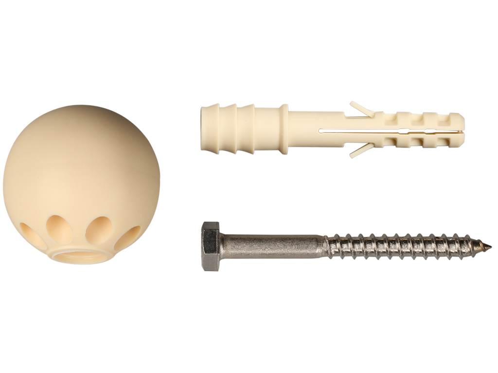 Комплект состоит из нейлонового дюбеля, установочного нержавеющего шурупа и декоративного сферического ограничителя различных расцветок. Ограничитель диаметром 35 мм изготовлен из износостойкого эластомера. Крепление к полу осуществляется при помощи шурупа и дюбеля.
