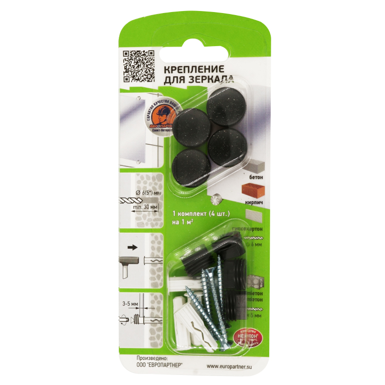 Входящий в комплект универсальный дюбель позволяет закрепиться в любые материалы основания. Один комплект крепления рассчитан на установку зеркала толщиной до 5 мм и общей площадью до 1 м2.