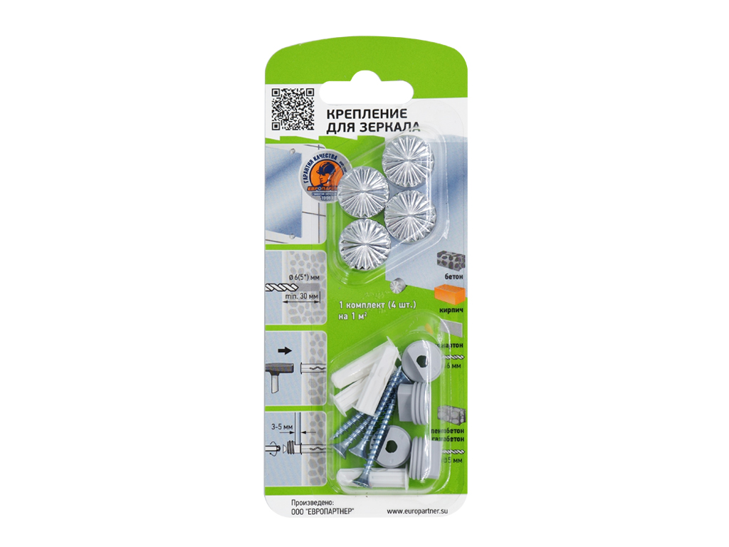 Входящий в комплект универсальный дюбель позволяет закрепиться в любые материалы основания. Один комплект крепления рассчитан на установку зеркала толщиной до 5 мм и общей площадью до 1 м2.