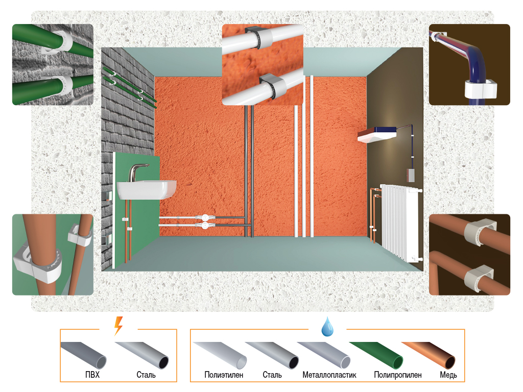 Крепеж-клипса предназначена для крепления медных, стальных, пластиковых труб и электротехнического кабеля.