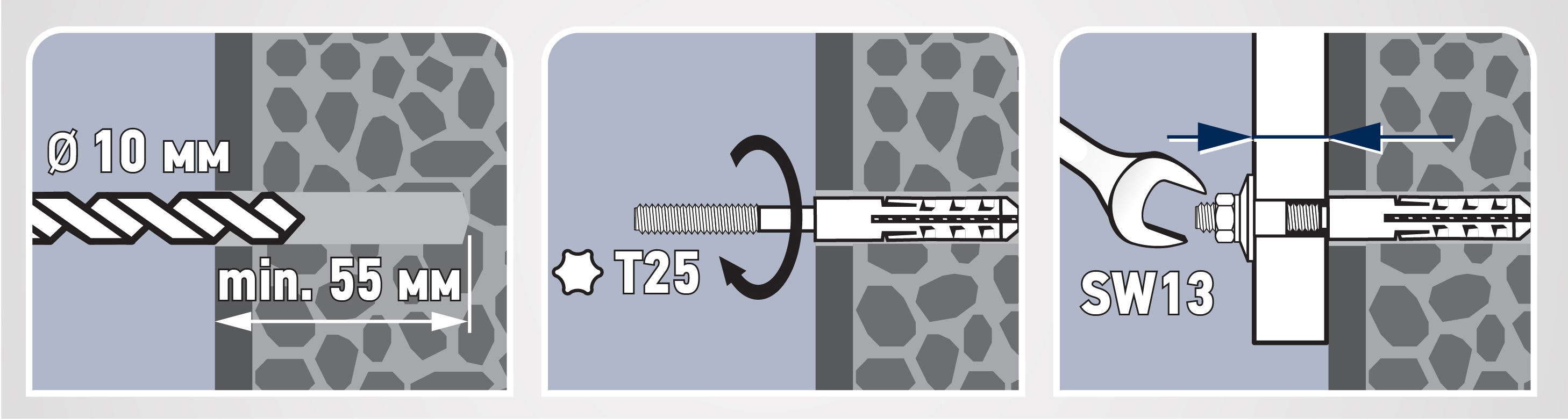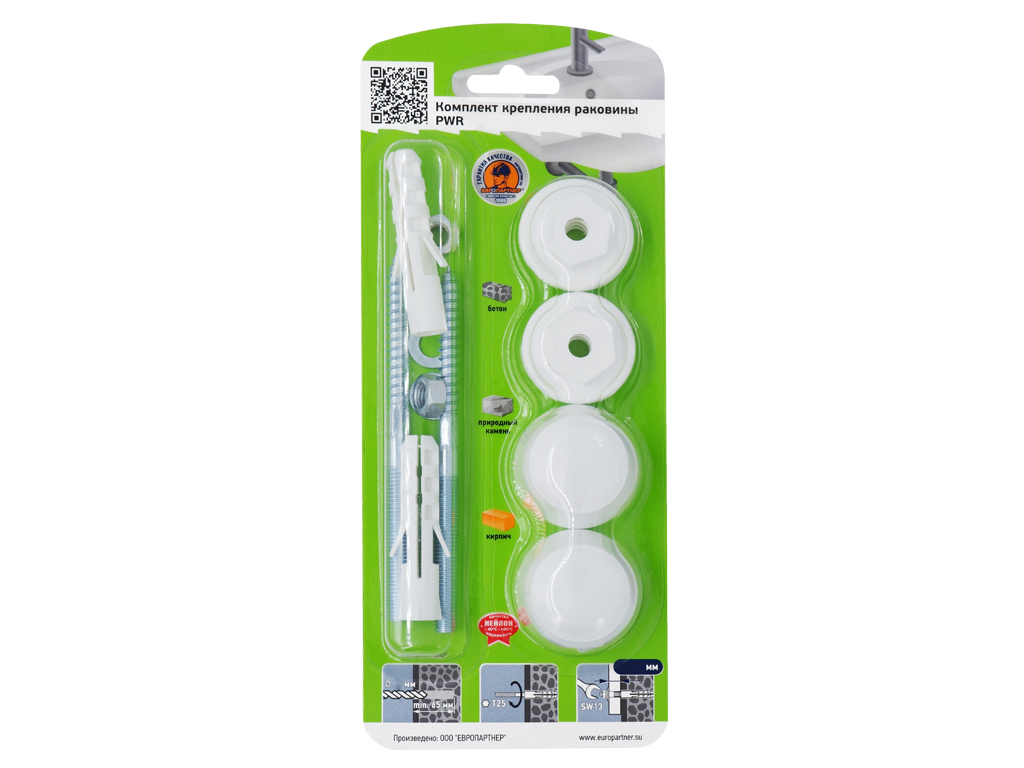 В комплекте PWR: нейлоновый дюбель, сантех. шпилька, оцинкованная гайка, оцинкованная шайба, гайка-втулка с эксцентриком + заглушка.
