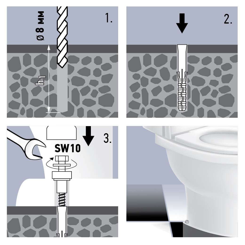 В комплекте PWC: 2 нейлоновых дюбеля, 2 сантех. шурупа, 2 нержавеющих шайбы, 2втулки + 4заглушки (2белых и 2хром)